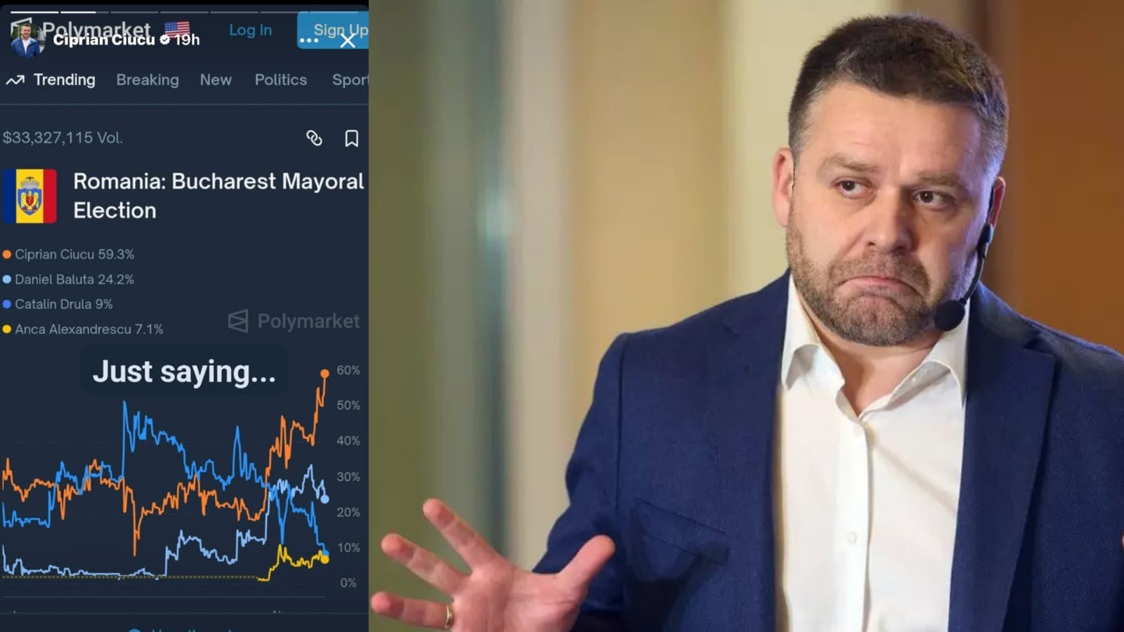 Ciprian Ciucu, primarul care face reclamă la pariuri ilegale. Edilul Sectorului 6 promovează Polymarket, un site interzis în România